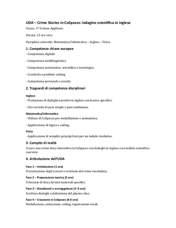 Questa è la bozza dell'UDA sulla attività che sto facendo in 1CSA con Luca Bracci (Fisica). Le discipline coinvolte sono matematica/inglese/fisica. Basandosi sulla Unit 2 del libro di testo Gateway B1 e su prompt forniti dai docenti, i ragazzi suddivisi in gruppi dovranno creare delle brevi storie poliziesche animate in inglese su Cospaces.